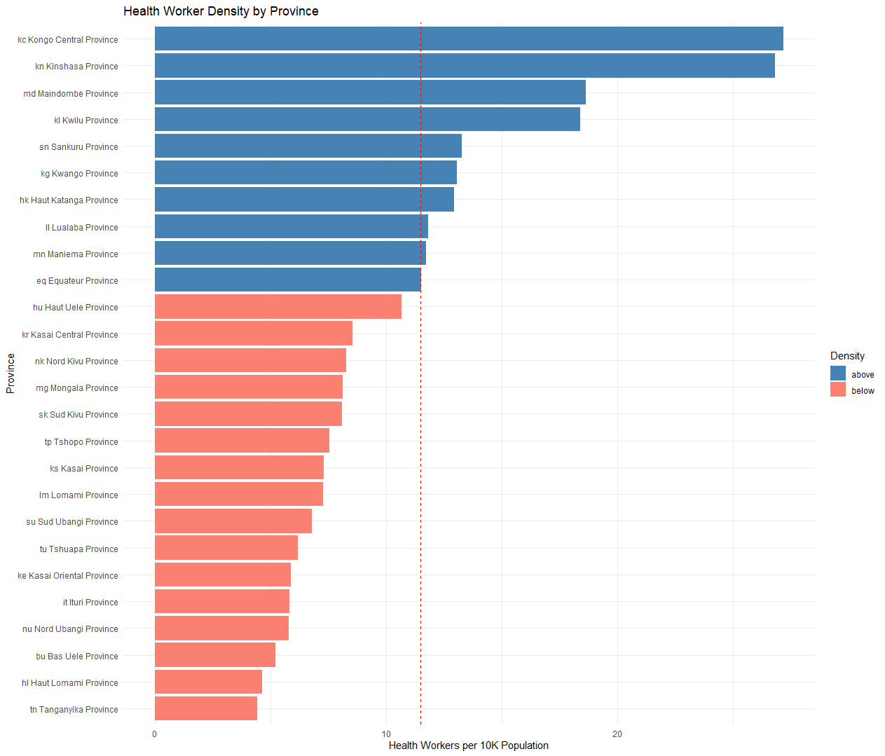 My dissertation focuses on the human resources for health (HRH) distribution in the Democratic Republic of the Congo (DRC). As part of this work, I'd like to investigate the distribution of human resources for health across the health zones of the DRC. We'll start with an analysis of health workforce data from the routine health information system.