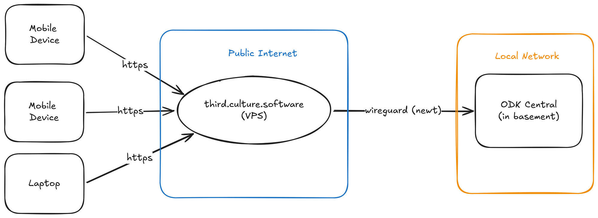 At this point, we have our VPS in the cloud with a domain name, and our ODK server in our basement, all configured. Now we just need to route traffic through the VPS to the local machine via a tunnel.