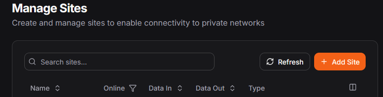 In the Pangolin interface, go to the "Sites" page and click "add a site". It should look like this below: