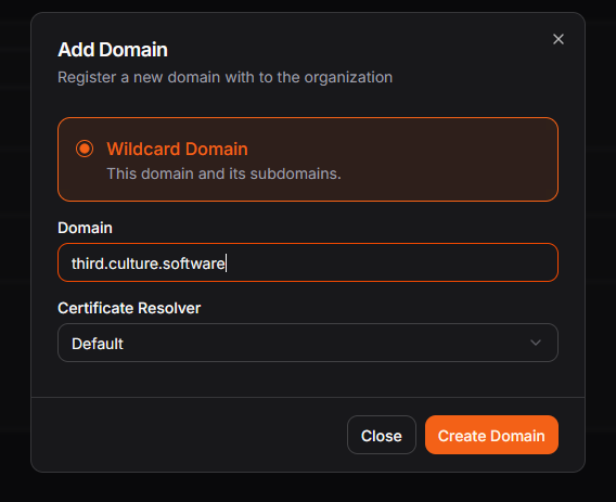 Once you have finished the installation, configure your first organization to your liking, add your domain as a wildcard domain (e.g. third.culture.software), and you'll be ready to set up your tunnel.