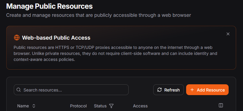 To create a new tunnel, go to "Resources > Public" on your Pangolin site and click "add a resource." It should look something like this:
